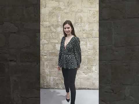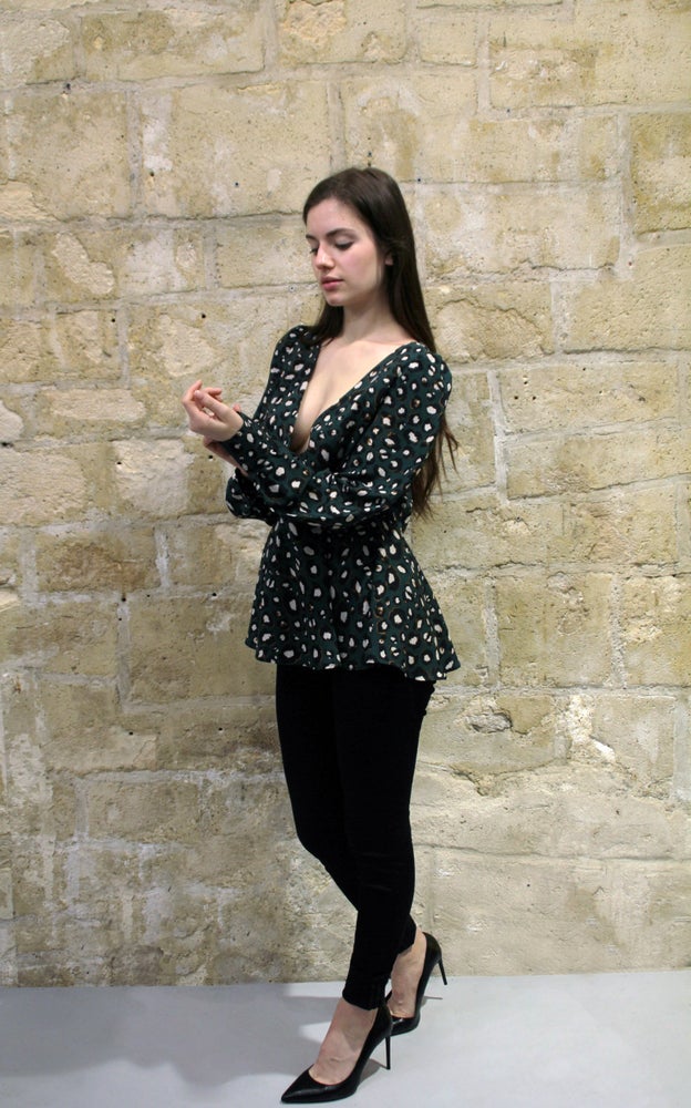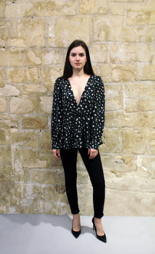 Easy to wear long-sleeved blouse with deep V cut in front.
