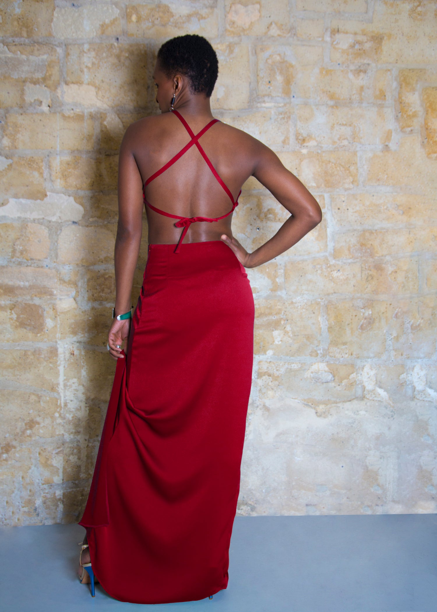 A long, flowing skirt highlighted by a cascading drape and dramatic split.