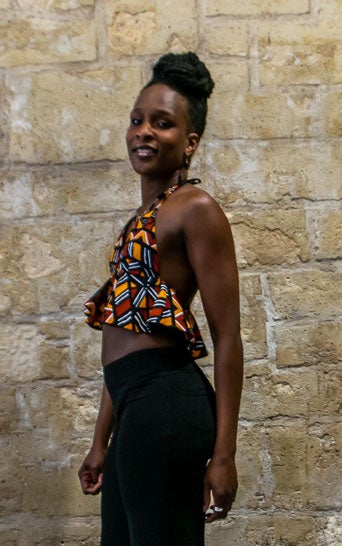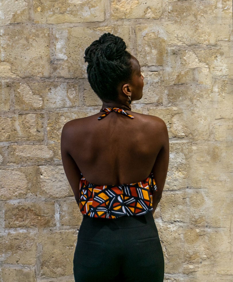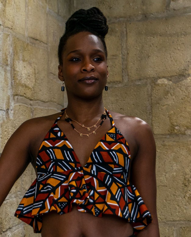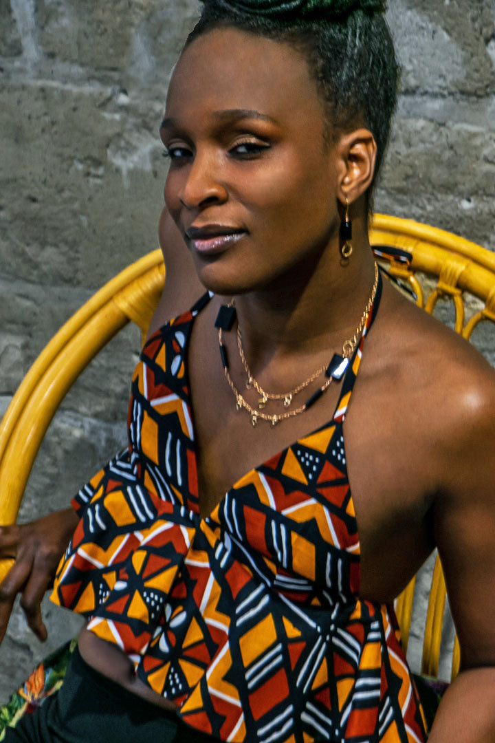 The graphic Bogolan print adds a bold flair to the frilly top.