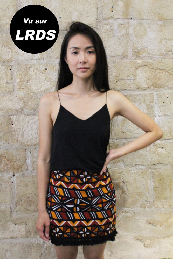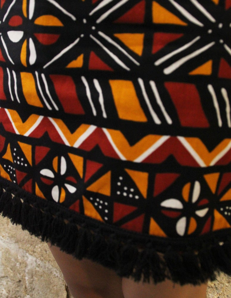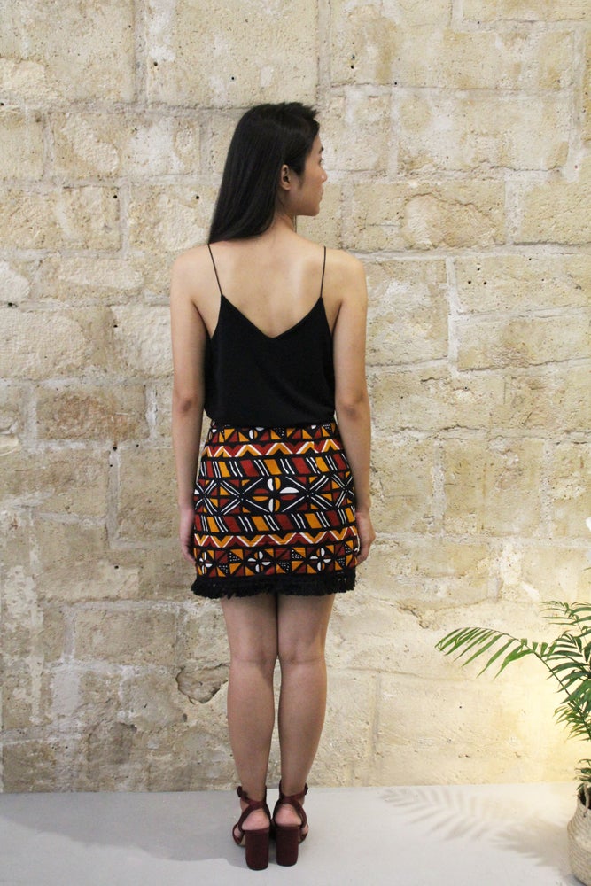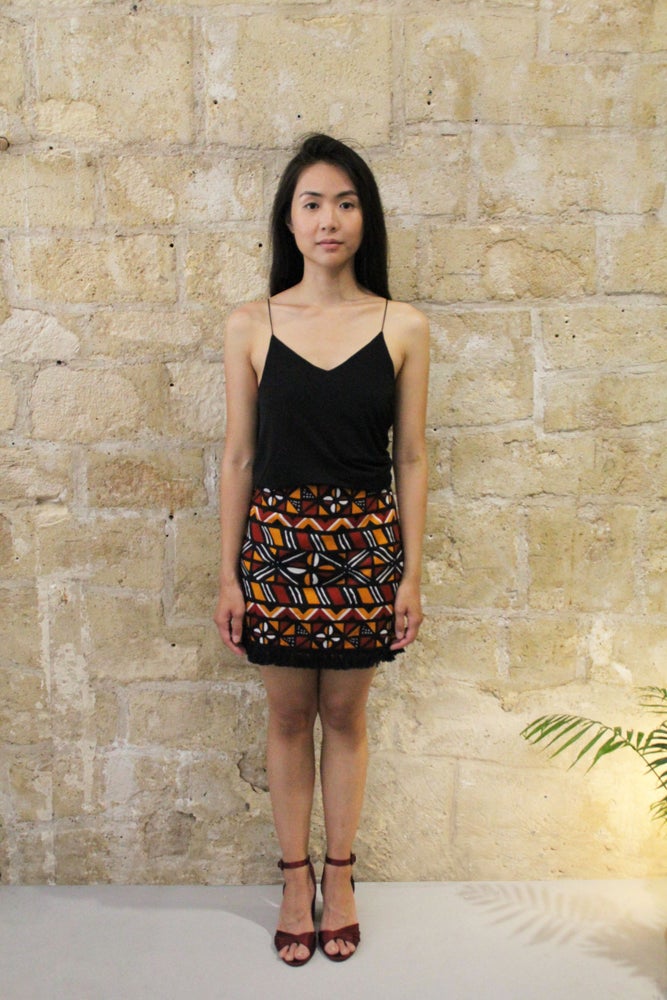 Bold Bogolan printed mini-skirt with fringed hem.